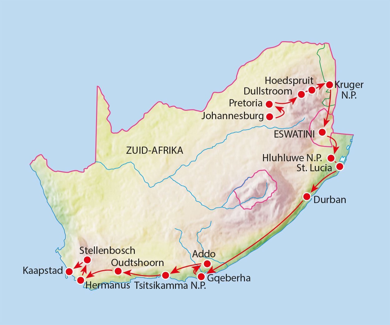Hieronder een overzicht van alle reizen waarbij je via Zuid Afrika gaat.