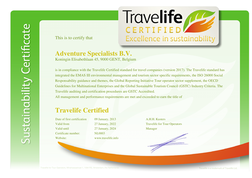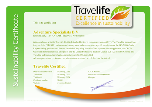 Het moederbedrijf van Koning Aap, Adventure Specialists, is als sinds 2013 Travelife Certified (de hoogst mogelijke certificering) voor de activiteiten van Koning Aap en zusterbedrijf Shoestring. Wat houdt dit in? Iedere twee jaar vindt er een controle plaats en moet Adventure Specialists zich op ruim 250 criteria verantwoorden met bewijsvoering.