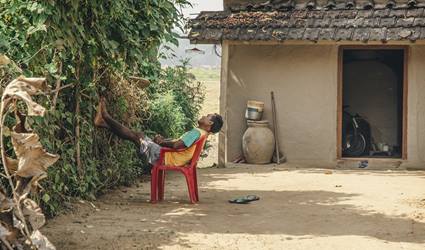 “Jah! Jah! Jah!” Een boer die zijn buffel ploegend door de aarde stuurt, wekt me. Ik stap uit bed en het moet gezegd: die lemen grond voelt echt aangenaam aan de voeten. Zacht en warm. Als je je gsm laat vallen, barst het scherm zelfs niet. Ik kijk naar de dode sprinkhaan, die intussen een leger mieren heeft aangetrokken, maar het deert me eigenlijk niet. Vermoedelijk betekent het dat ik al na één nacht een hernieuwde connectie heb met Moeder Aarde. Ik duw de houten deur open en loop het ontwakende dorpje in.