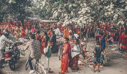 Maar kleur krijgt altijd de bovenhand. We stoppen op een marktje, wriemelend van mensen, ondoordringbaar door bossen slingers van goudsbloemen. Diwali komt eraan, een groot Hindu-feest waarbij niet alleen de goden, maar ook de dieren worden gevierd, vijf dagen lang. Iedereen is op zoek naar kaarsen, lichtslingers en eten. Een beetje zoals wij met kerst.