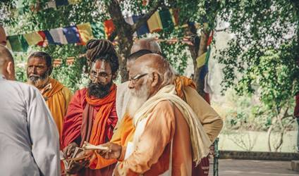 Het is tevens tijd om te vertrekken. We krijgen bloemenkransen om en worden gezegend met een felrode tika tussen de wenkbrauwen, waarvan een beetje vermiljoen op de tip van mijn neus valt. Maar dat zie ik pas ’s avonds in de spiegel.