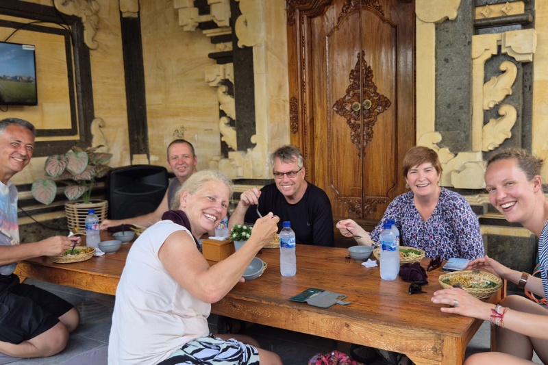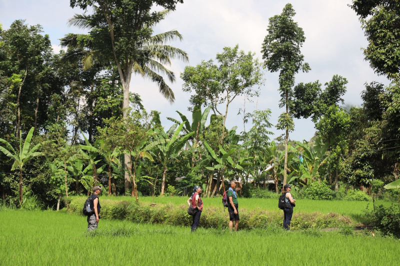 Op het eiland Lombok verblijf je twee nachten in het rustige dorpje Tetebatu, omringd door groene rijstvelden en met uitzicht op de Rinjani-vulkaan. Vanuit het hotel maakten we samen met een lokale gids een wandeling van ongeveer drie uur over kleine, onontdekte paadjes. Onderweg zagen we locals die rijst aan het planten waren op de velden. Halverwege stopten we voor een pauze met lokale hapjes en een drankje, op een mooie plek midden tussen de rijstvelden. In de bomen zagen we zwarte apen die ons nieuwsgierig in de gaten hielden.