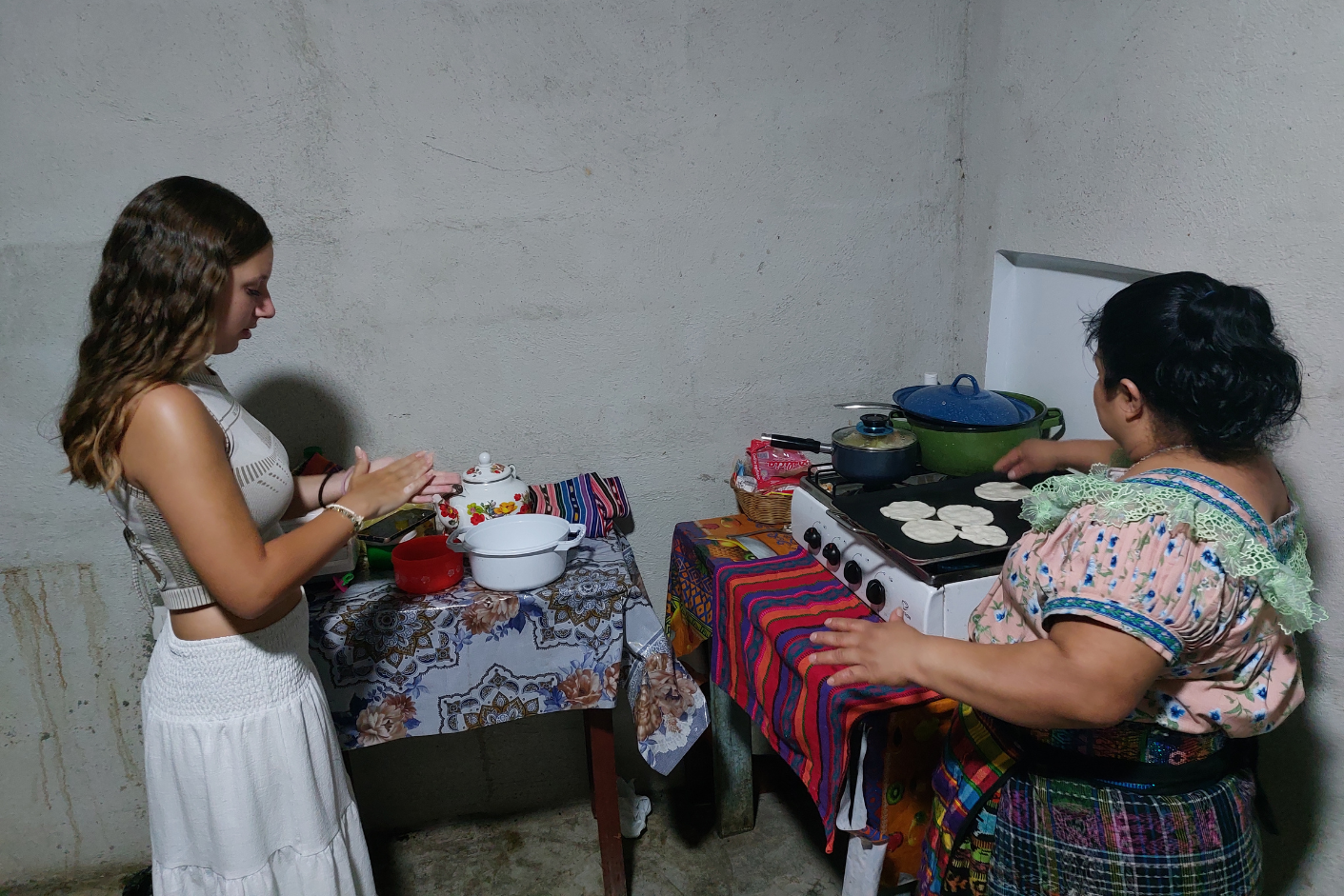 Aan het Atitlánmeer verbleven we een nacht bij een lokale familie in San Juan La Laguna. Bij aankomst werden we verdeeld over de families. Ons gezin was druk in de keuken terwijl hun 3-jarige dochtertje speelde. We hielpen mee met tortilla’s bakken en speelden met Fatima. Ondanks dat ik niet goed Spaans spreek en ons gezin alleen Spaans en het lokale Tz’utujil-dialect spreekt, lukte het ons om een gesprek te voeren. We leerden enkele woorden in hun taal en toen we ‘sochtends Sakaré’ (goedemorgen) zeiden, straalden ze van blijdschap.