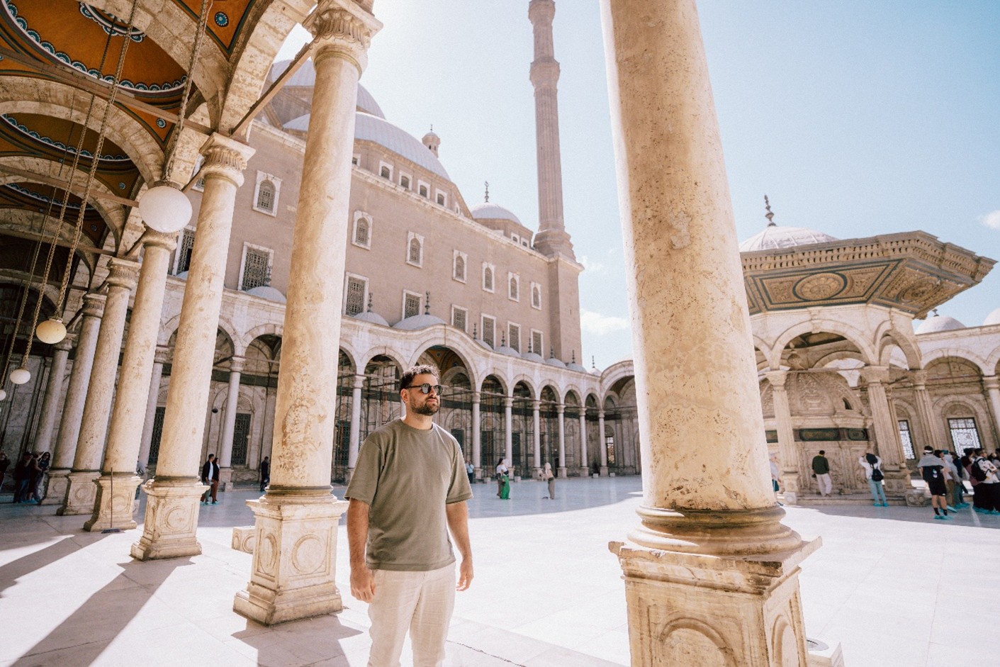 In mijn foto’s hou ik van contrasten. Het vertelt een verhaal en het licht iets uit. Of het nu licht en donker is, druk en rustig, of oud en nieuw. Het geeft foto’s een geweldige dynamiek. Op de achtergrond zie je de imposante piramides. Voor mij weerspiegelt het hoe het moderne leven en de historie van de stad hand in hand gaan. Dat contrast tussen oud en nieuw maakt Egypte zo bijzonder. Dit soort momenten ervaar je tijdens een groepsreis Egypte echt overal.