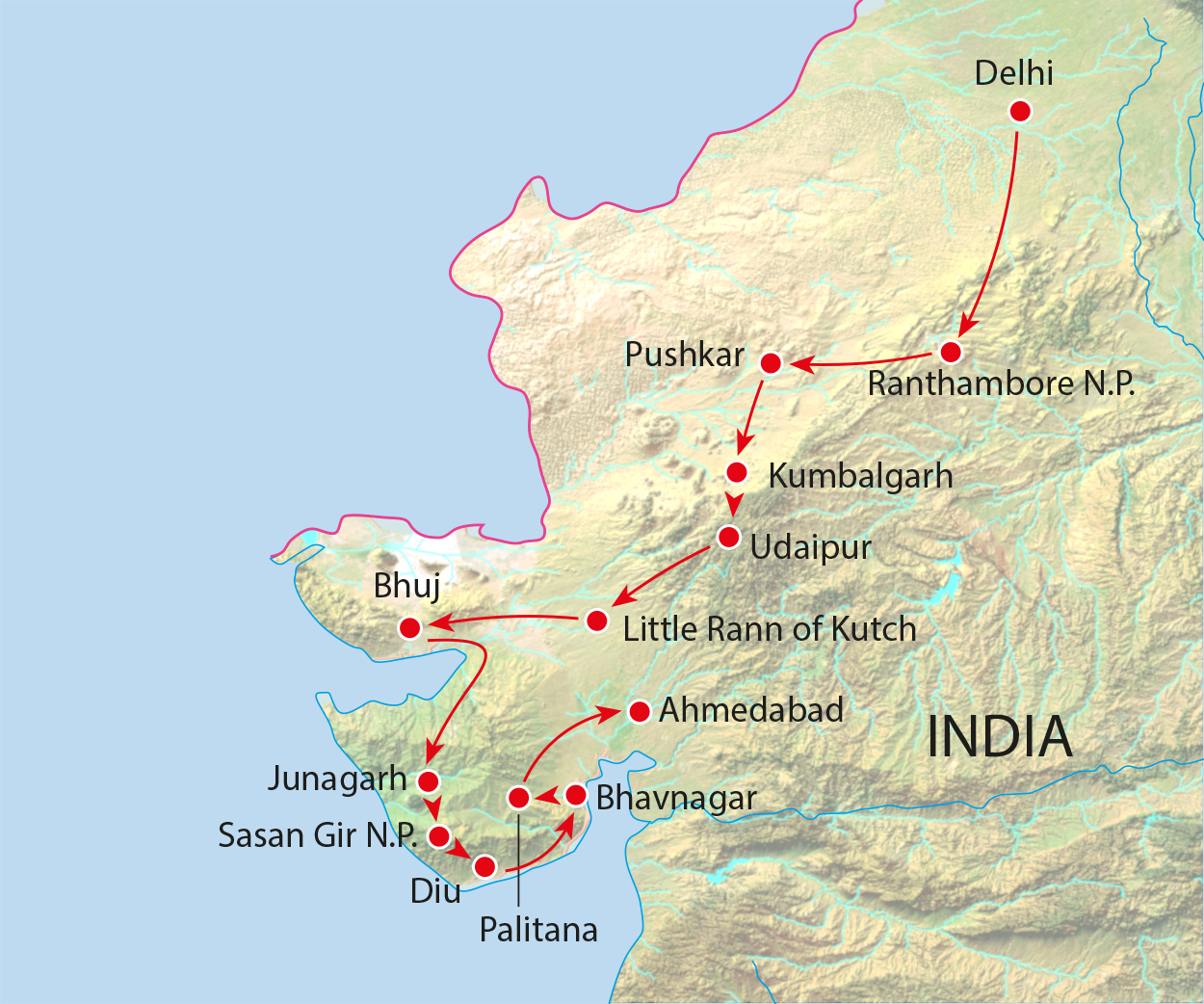 Wie toeristisch ongerept India wil zien, kan zijn hart ophalen in Gujarat en Rajasthan. De deelstaten staan bekend om hun traditionele, kleurrijk geklede bevolking. Woestijn, jungle, berggebied en zee maken de regio zeer afwisselend. Je gaat op zoek naar wilde leeuwen én tijgers en bezoekt heilige bergen vol tempels, stammen en middeleeuwse steden. Ook de metropolen Delhi en Ahmedabad komen aan bod. Kortom, een rondreis voor de échte India liefhebber!